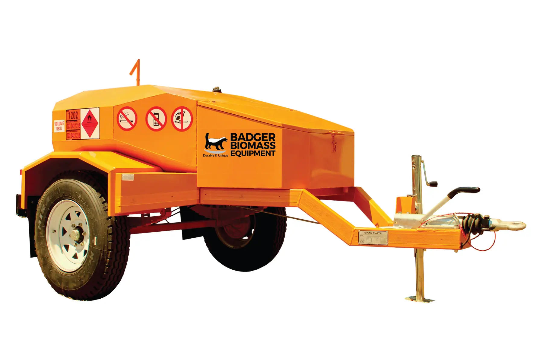 The Badger Diesel Bowser 1 000 is a heavy-duty mobile diesel trailer with a 998-litre capacity, featuring enclosed, lockable equipment and a standard tow eye for secure off-road navigation.