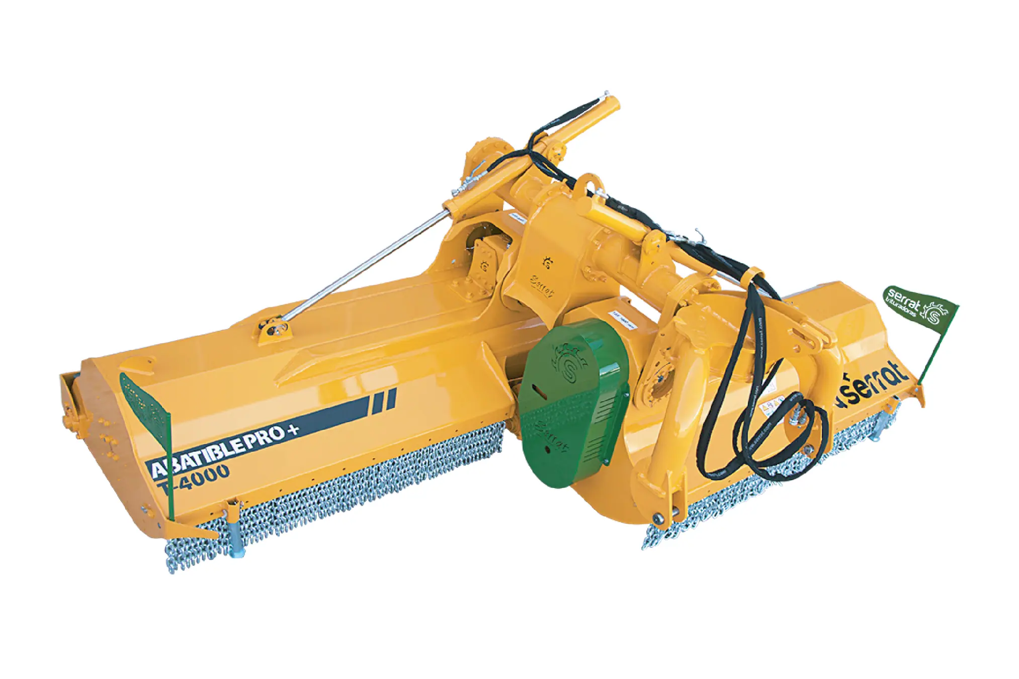 The Serrat Abatible Pro Plus is a robust agricultural mulcher designed for large-scale farming, efficiently handling maize, corn stalks, and straw with its swinging hammers, available in working widths from 3.8m to 7.3m.